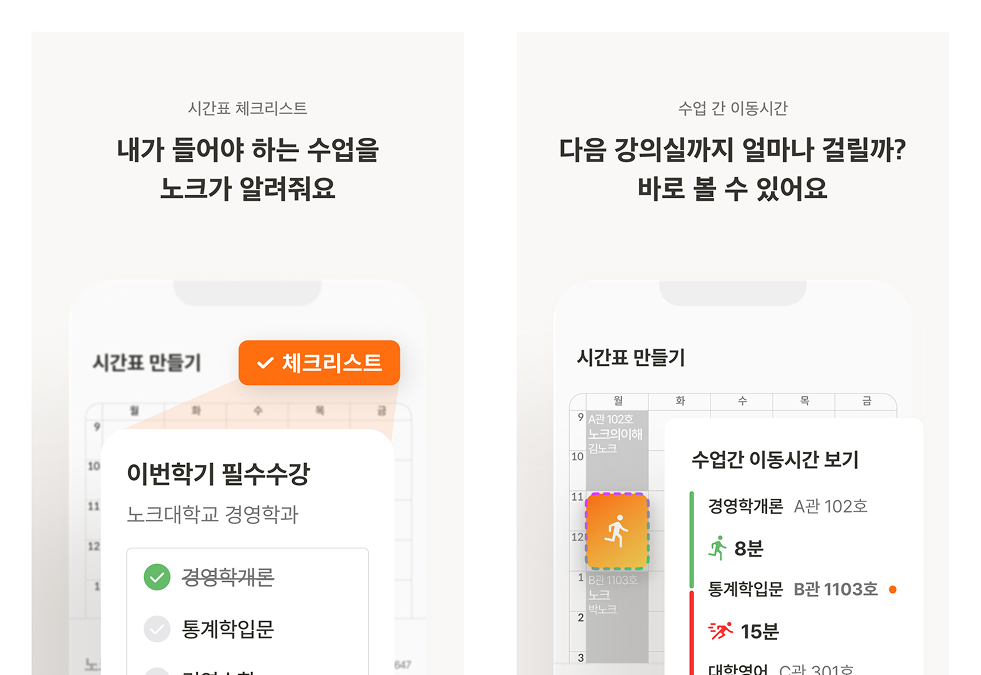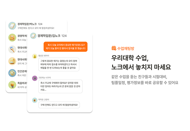 “생활밀착형 서비스 노크는 대학생이 캠퍼스 생활에서 겪는 다양한 불편함을 노크에서 안전하게 해결하도록 돕는 AI기반 커뮤니티 서비스다. 시간표 관리, 강의 정보 공유 및 교환, 대학생 간 소셜링 등 대학 생활 전반의 니즈를 충족시키고 있다. ”